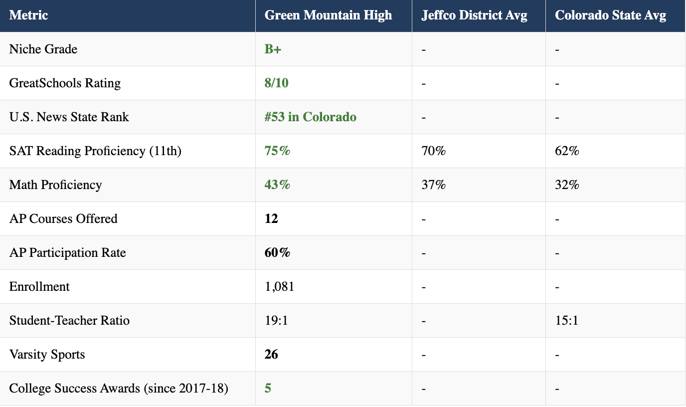 Green Mountain High consistently ranks in the top 25% of Colorado high schools (Source: SchoolDigger). The school has earned 5 College Success Awards since 2017-18 from GreatSchools for preparing students for postsecondary education (Source: GreatSchools.org). It offers 12 AP courses with a 60% participation rate, well above the statewide median (Source: U.S. News). The school also offers capstone programs and academic pathways for postsecondary workforce readiness, which are a distinguishing feature of the Green Mountain articulation area (Source: Jeffco Public Schools).