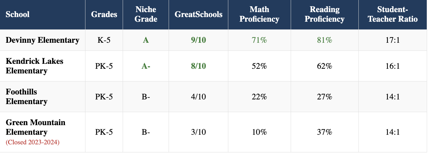 School quality directly correlates with home prices in Green Mountain, and I see it in every listing I touch. Homes within the Devinny Elementary boundary consistently sell for a premium compared to similar homes in other Green Mountain elementary zones. The average home value near Devinny is approximately $691,000 (Source: Homes.com), while homes in other parts of Green Mountain may start closer to $575,000-$625,000 for comparable square footage.