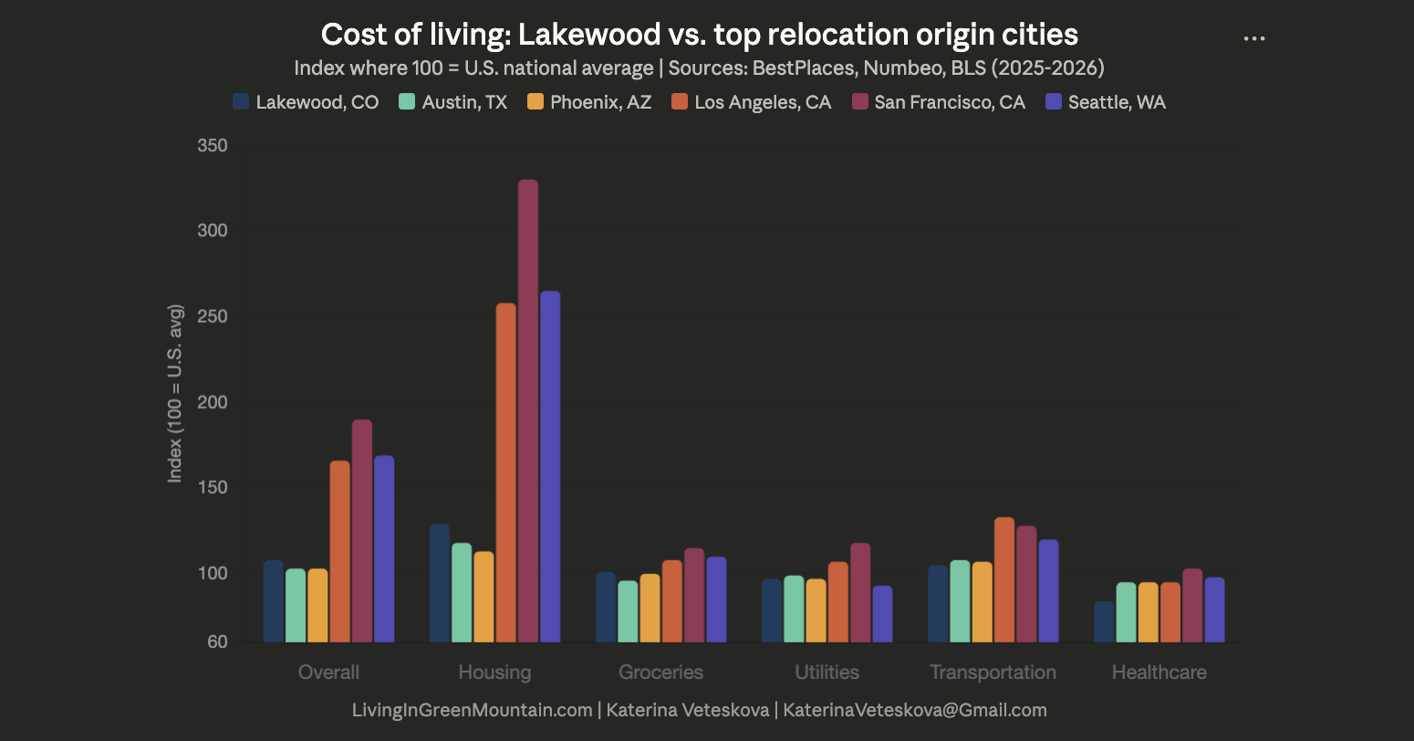 What draws most people, though, is the lifestyle equation. You get a legitimate city with restaurants, arts, and amenities at Belmar, real trail access from neighborhoods like Green Mountain that opens onto hundreds of acres of open space, and a commute to downtown Denver that stays under 30 minutes most days. The cost of living runs roughly 7% above the national average, driven primarily by housing costs Nesttonestmoving, but that is a meaningful discount compared to the California, Texas, and Illinois markets that most of our relocating buyers are leaving behind.