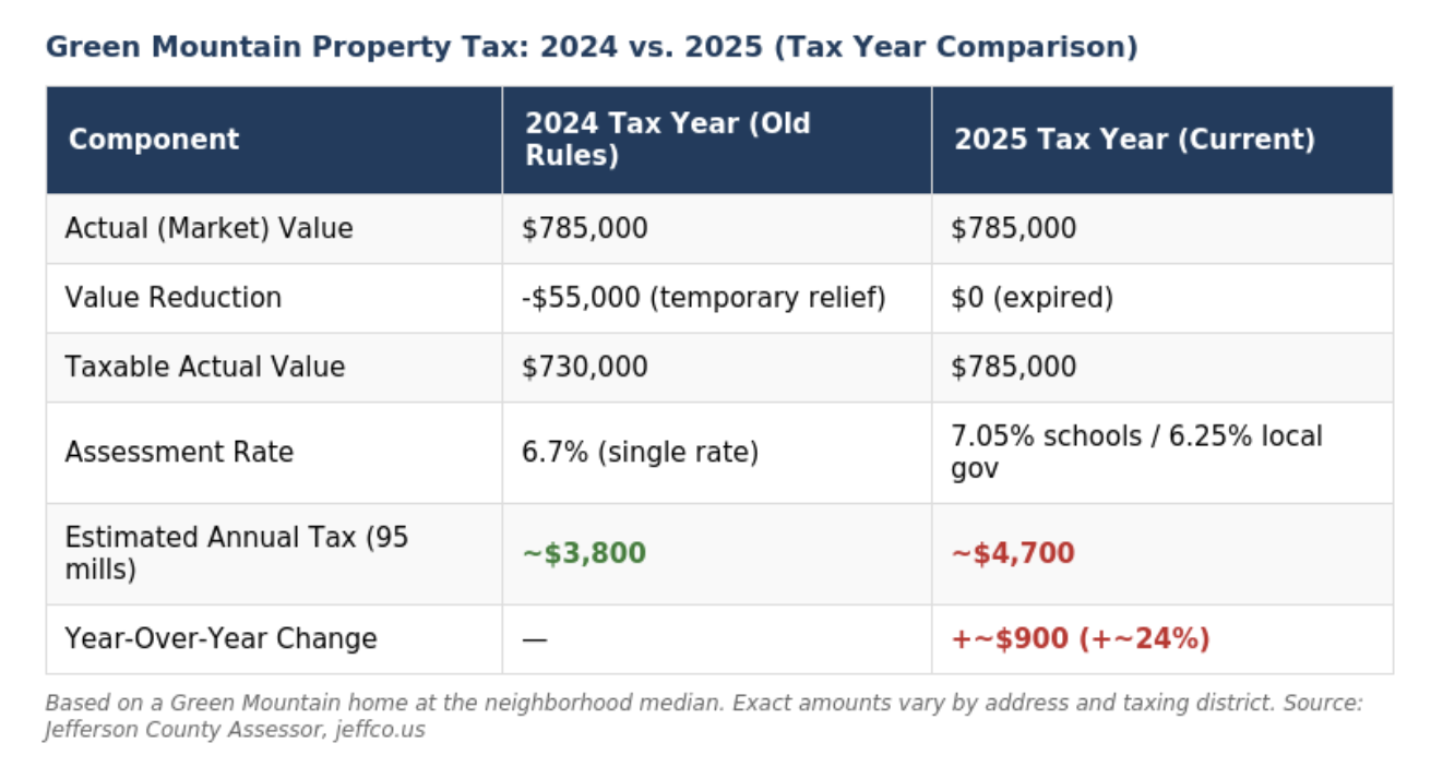 Green Mountain homeowners in Lakewood, Colorado typically pay between $4,200 and $5,200 per year in property taxes on a home valued near the neighborhood median of approximately $785,000 (Source: REcolorado Q4 2025). That effective rate, roughly 0.55-0.66% of market value, is significantly lower than the national median of about 1.02% (Source: Ownwell, Jefferson County data). However, tax year 2025 bills, which arrived in early 2026, jumped 15-20% for most Jefferson County homeowners due to expiring state tax relief, and understanding exactly why, and what you can do about it, matters whether you are buying, selling, or staying put in Green Mountain.