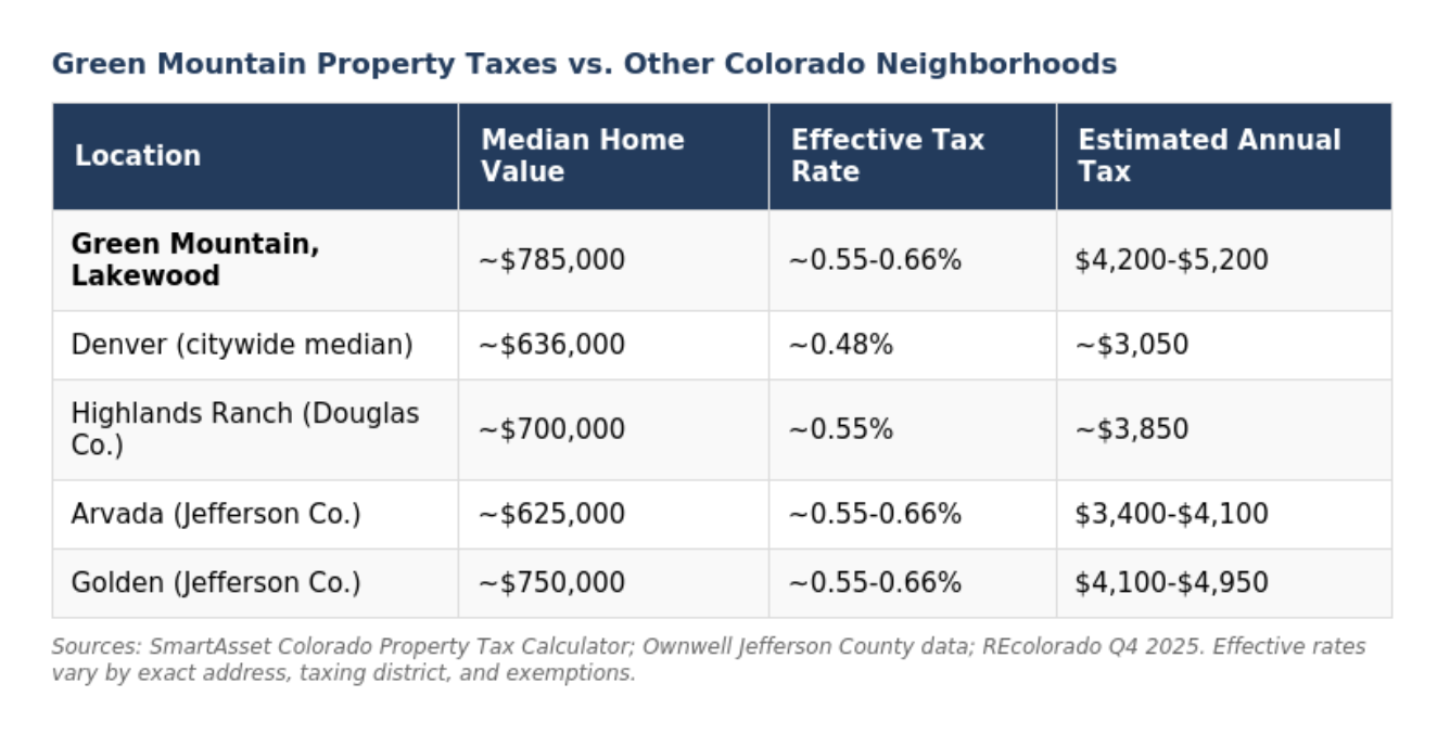 How much are property taxes on a typical Green Mountain home in Lakewood? A Green Mountain home valued at approximately $785,000 (the current neighborhood median) pays roughly $4,200-$5,200 per year in property taxes, depending on the specific taxing districts at that address. Jefferson County's median effective tax rate is approximately 0.51-0.66% of market value (Source: Ownwell, SmartAsset), which is well below the national median of about 1.02%.